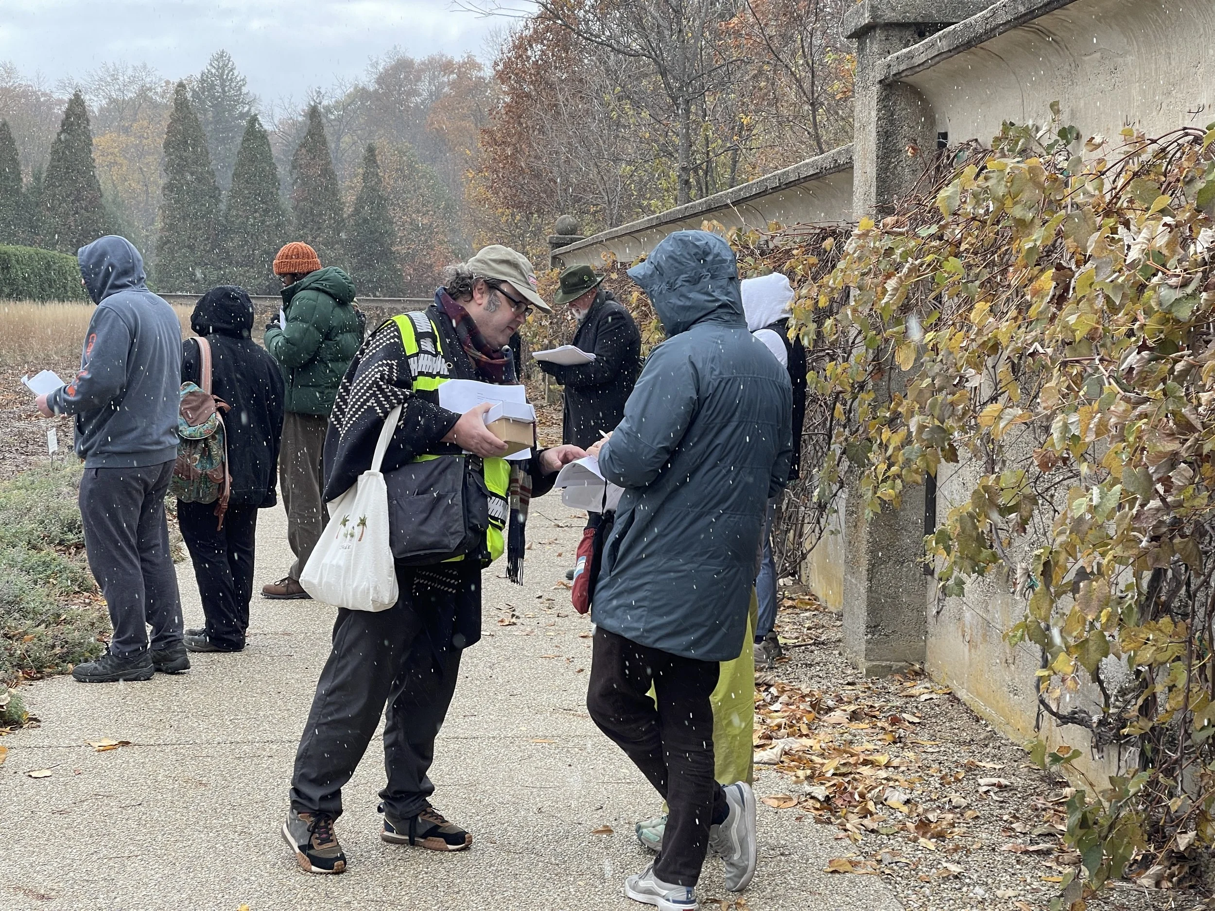 Thus, this workshop comes to be designed as a journey of perceptual discovery, guided by the effort to lens and articulate the unique perspectives of this imagined worldview, I encourage participants to search for themselves on the guided walk—the artist’s world drawn out of the studio and into the landscape. I write the text for it in the early days here and map it across the garden’s vast architecture—through its mazes, hedges, and hidden nooks. At each site, I peg a short performance prompt: invitations to reimagine the space two hundred years ago, or as inhabited by other, unseen creatures, or prompts to listen for sounds that might have existed here in prehistoric times. I'll post the workshop after the diaries are completed, which anyone can use to go on the walk themselves. It includes QR codes for those who would like to mix responding to the mapped prompts with audio researched to help provide resources for enriching place history, including recordings by previous Allerton Artists-in-Residence, recordings of residents maintained by the Monticello public library, and other audio.